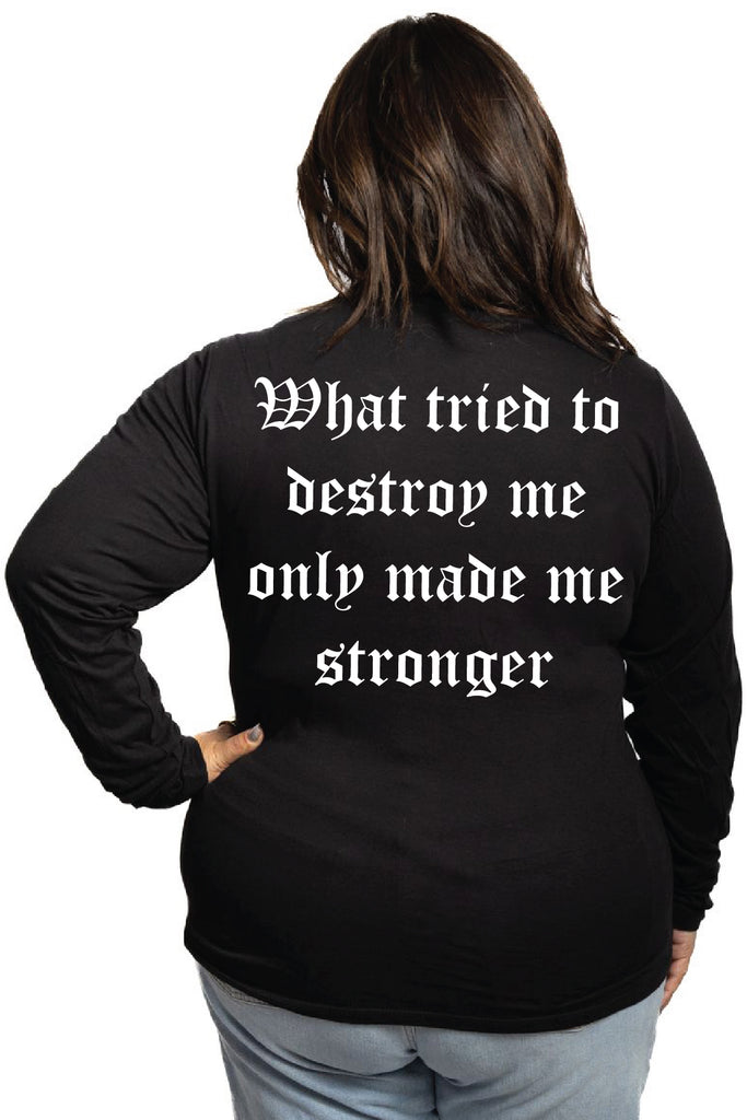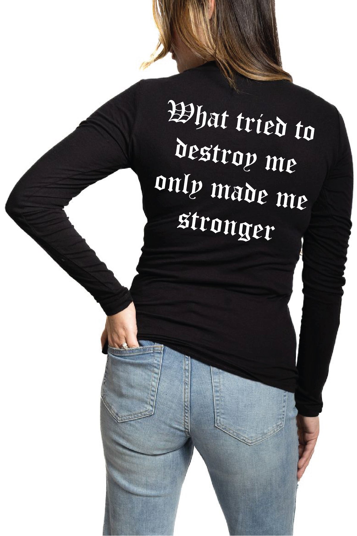 Wear your strength like a badge. This fitted long sleeve isn’t just a top—it’s a statement. With bold gothic lettering on the back that reads "What tried to destroy me only made me stronger", this piece is for the women who’ve been through hell and came out stronger. A reminder that beauty and chaos often go hand in hand.