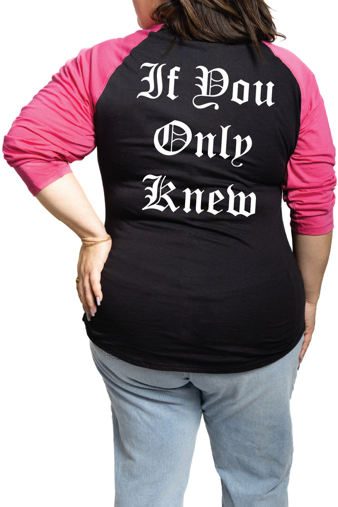 The bold gothic lettering on the back says it loud: "If You Only Knew". The front keeps it clean with a sharp “BD” chest hit, repping Beautiful Disaster with pride. The black body and bright pink 3/4 sleeves strike that perfect balance between fierce and feminine. It's soft, comfortable, and ready to back you up wherever the day takes you.