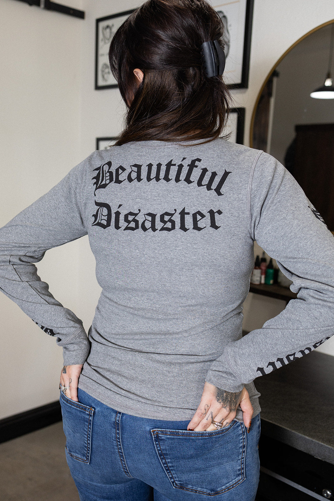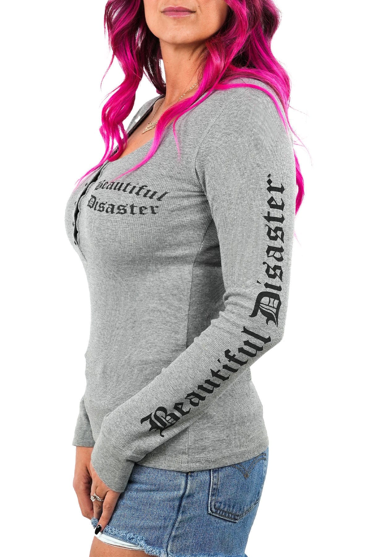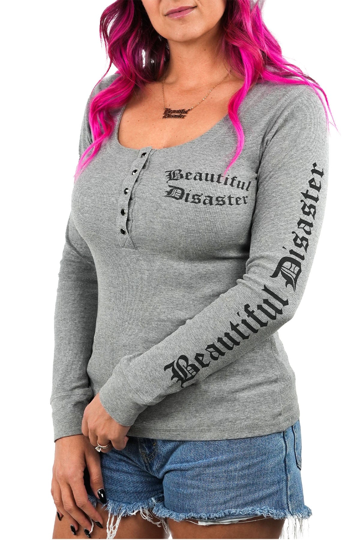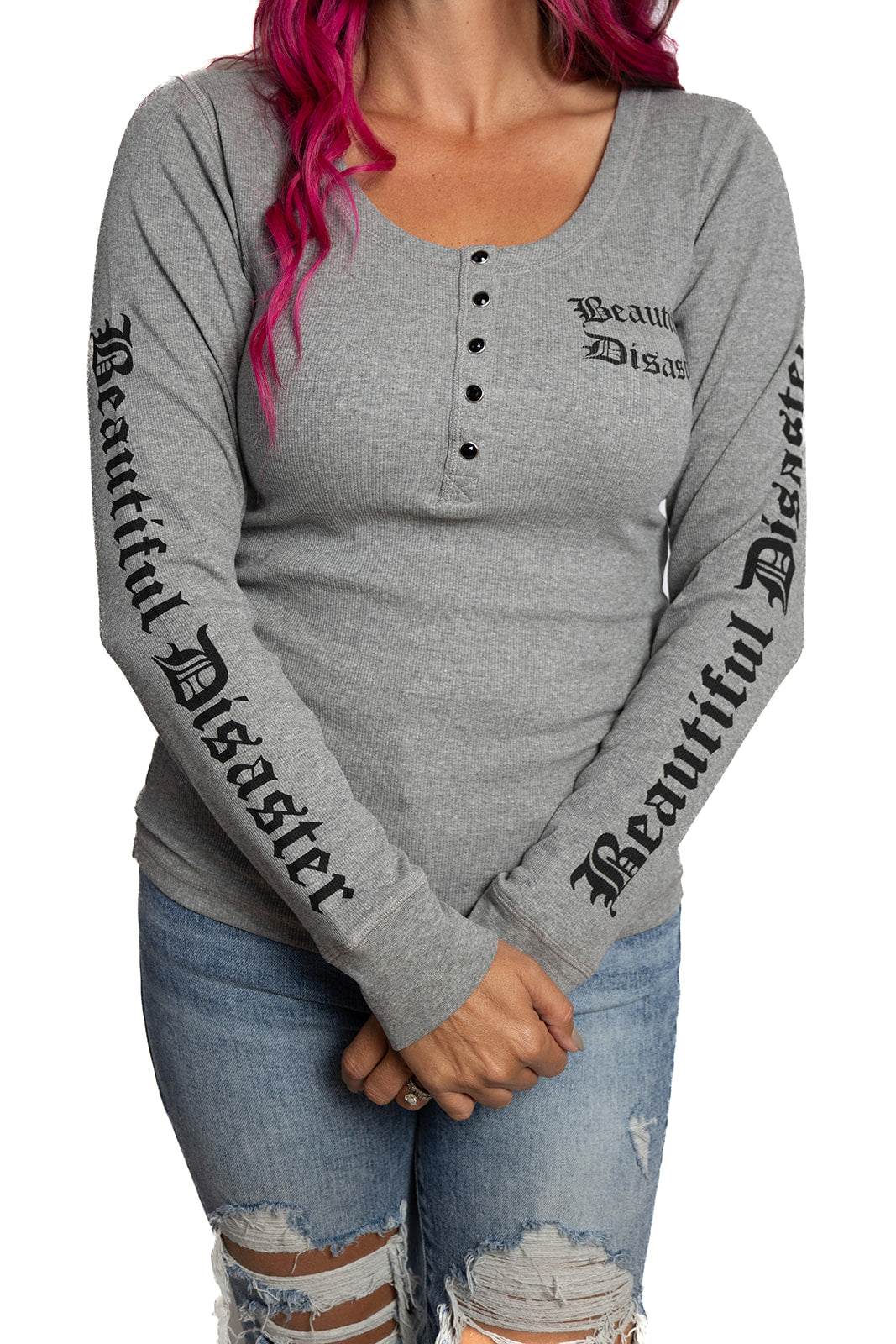 This soft and casual henley adds an elevated touch to your wardrobe, crafted from our softest, ribbed-knit cotton with excellent stretch for a truly flattering fit.  Features a scooped neck with rhinestone snap front.