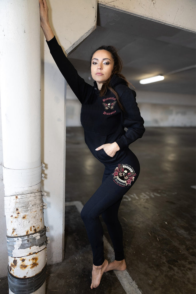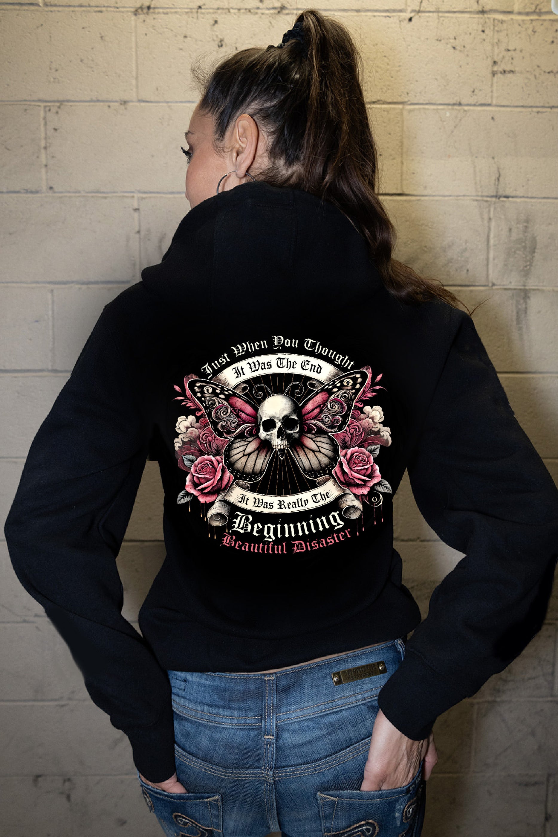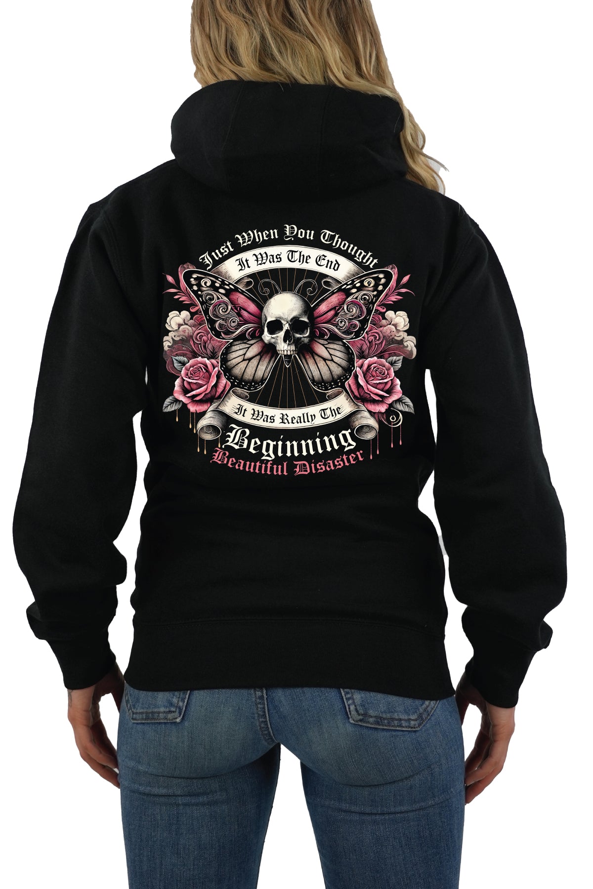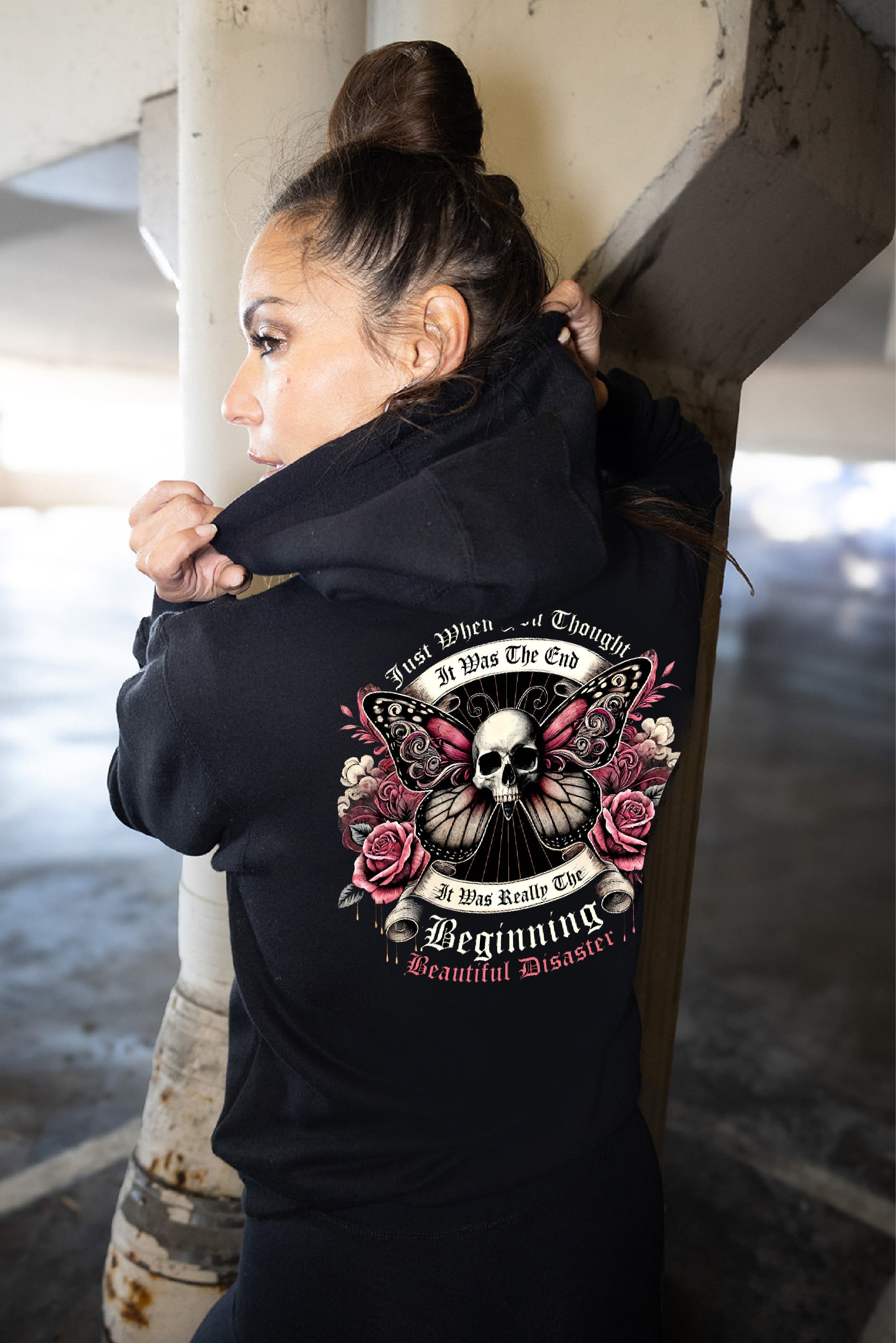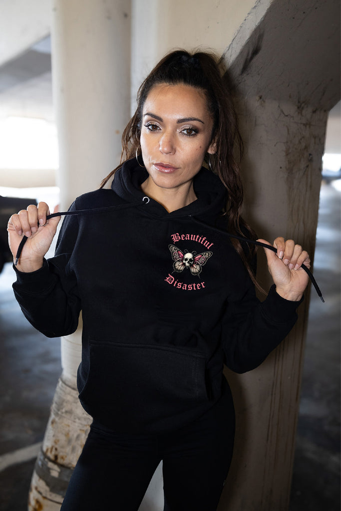Designed for comfort and empowerment, this soft, cozy pullover will wrap you in warmth while reminding you of your resilience. The front features our iconic Beautiful Disaster logo and butterfly skull design — a bold statement of beauty through chaos.