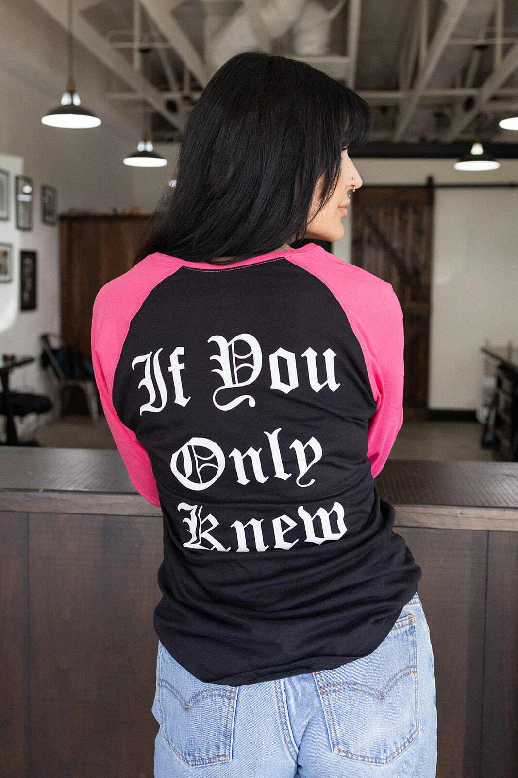 The bold gothic lettering on the back says it loud: "If You Only Knew". The front keeps it clean with a sharp “BD” chest hit, repping Beautiful Disaster with pride. The black body and bright pink 3/4 sleeves strike that perfect balance between fierce and feminine. It's soft, comfortable, and ready to back you up wherever the day takes you.