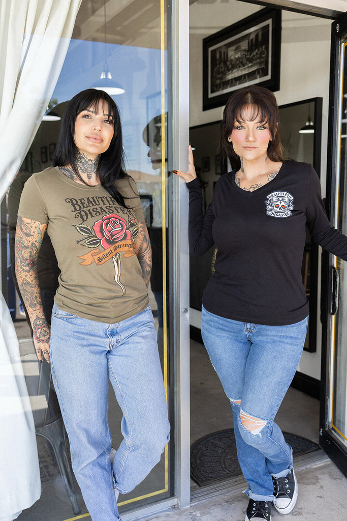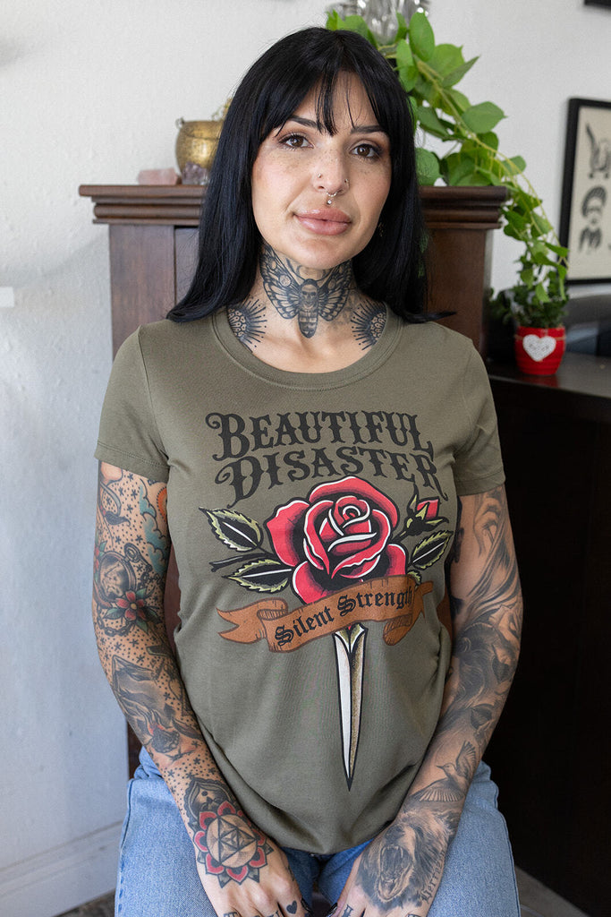Front and center: a rose wrapped around a dagger, crowned with Beautiful Disaster and framed by the words Silent Strength. It’s a symbol of grace under pressure, beauty through pain, and the ability to rise when no one’s watching. The back features a delicate vertical rose spine graphic—a soft but striking reminder that even what looks gentle can be strong as hell.
