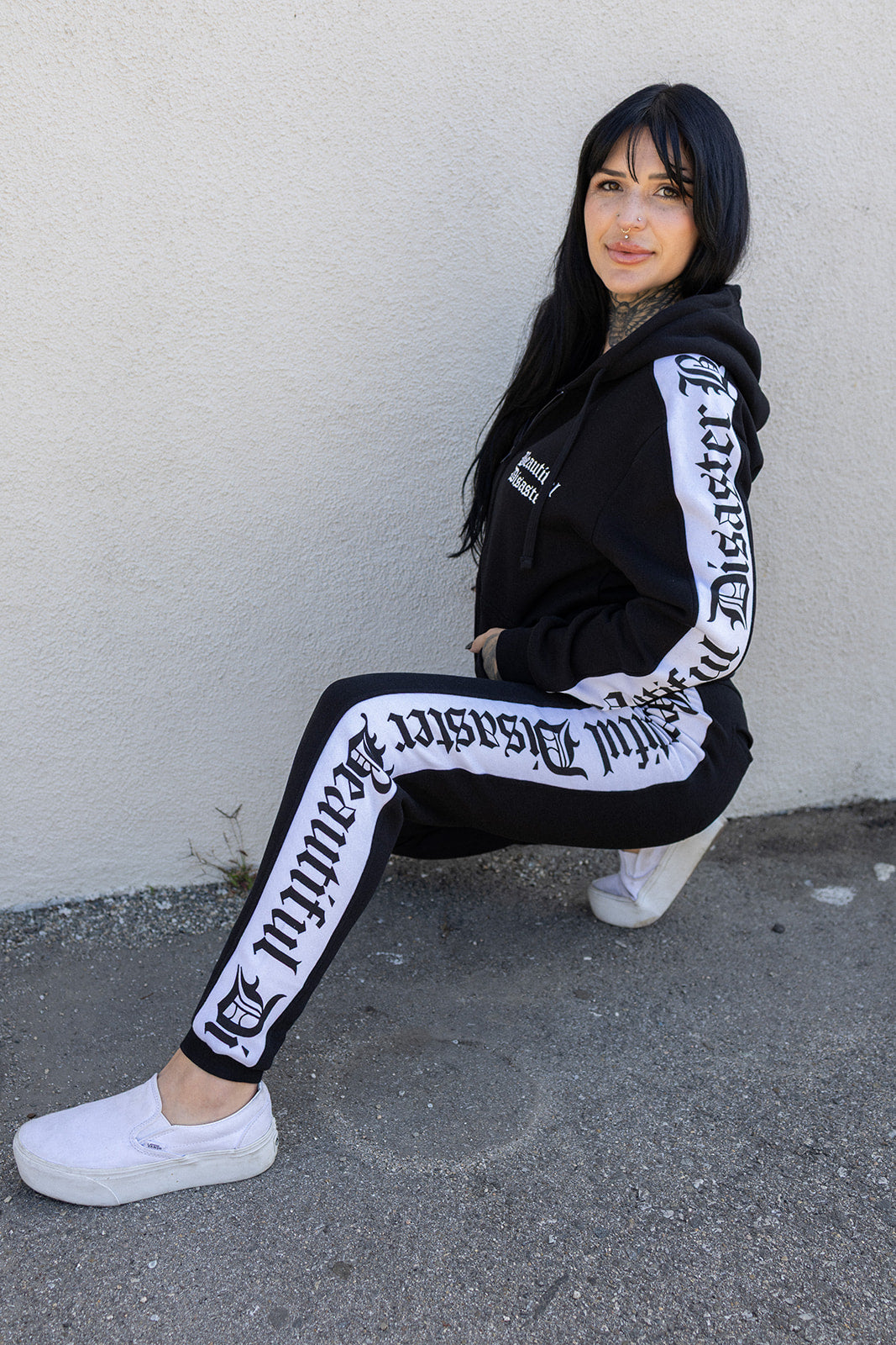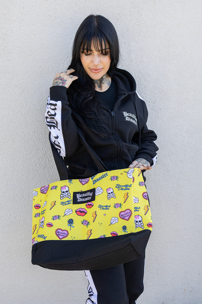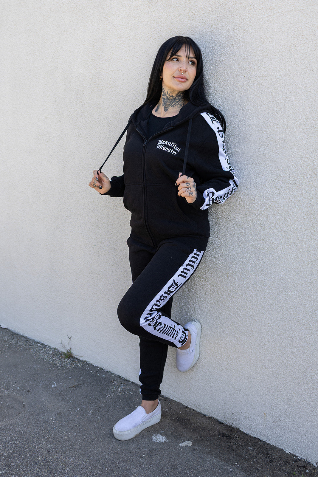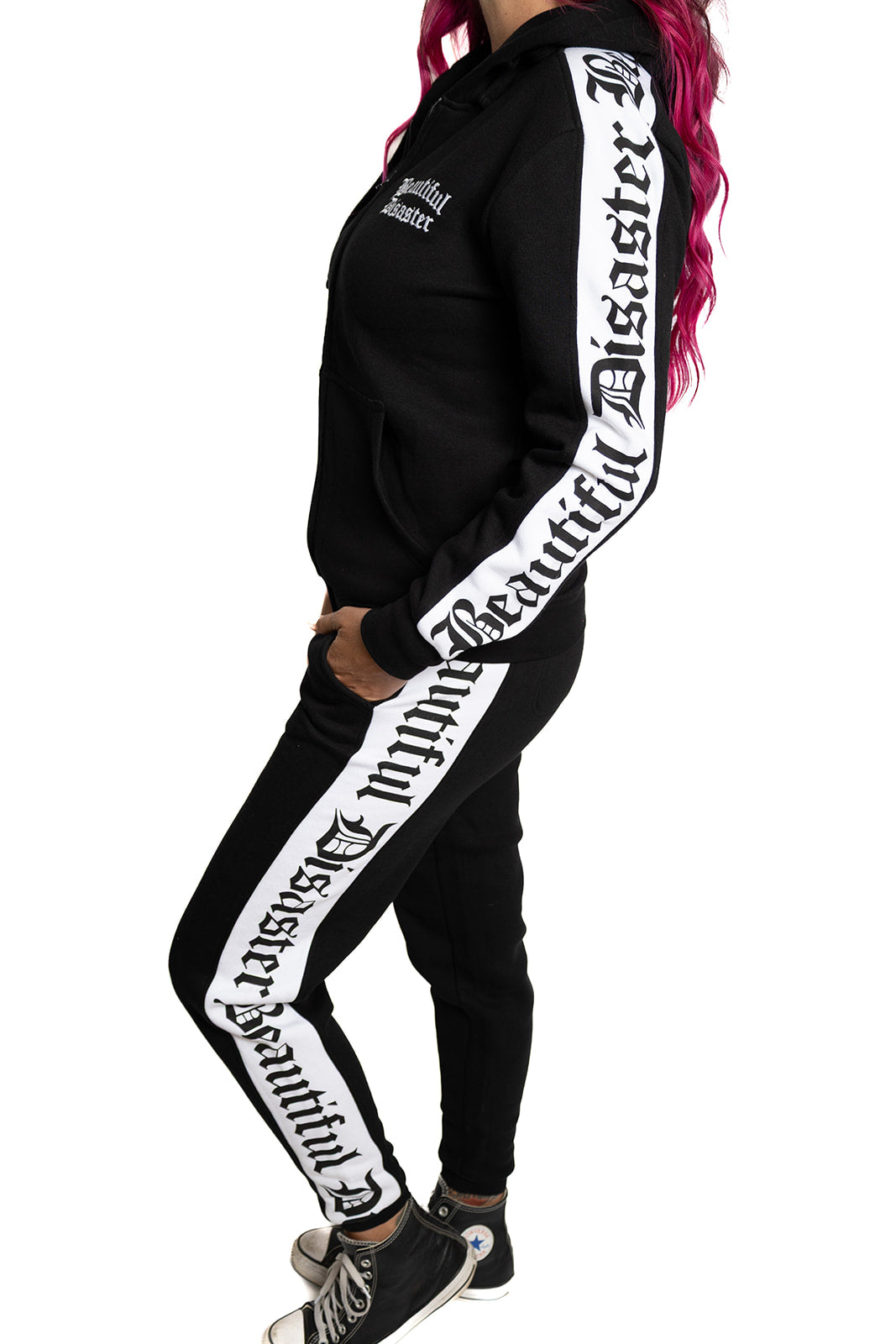 • Bold “Beautiful Disaster” repeating logo side panels on both sleeves