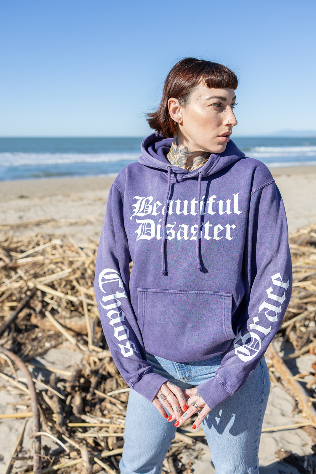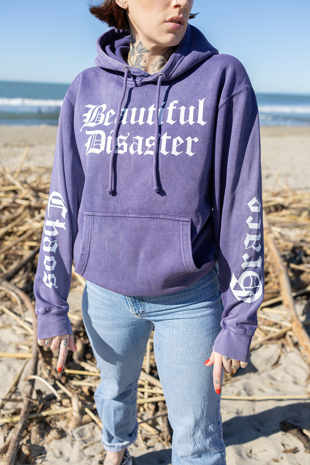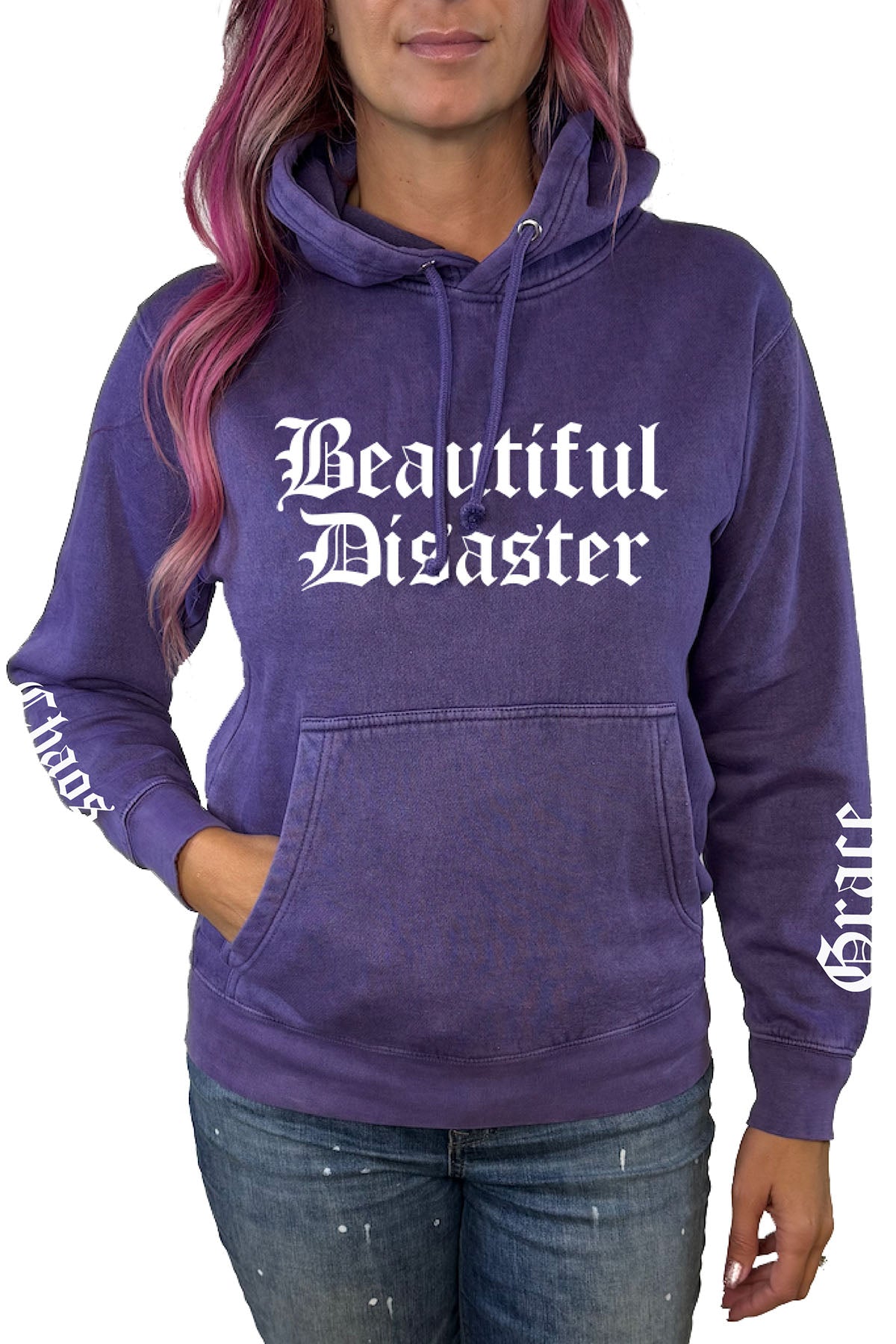 This ultra-soft mineral wash hoodie features our signature paisley mermaid art on the back, wrapped in the words Beautiful Disaster, Chaos & Grace . Bold sleeve prints and a front logo make this piece a full-on vibe from every angle.