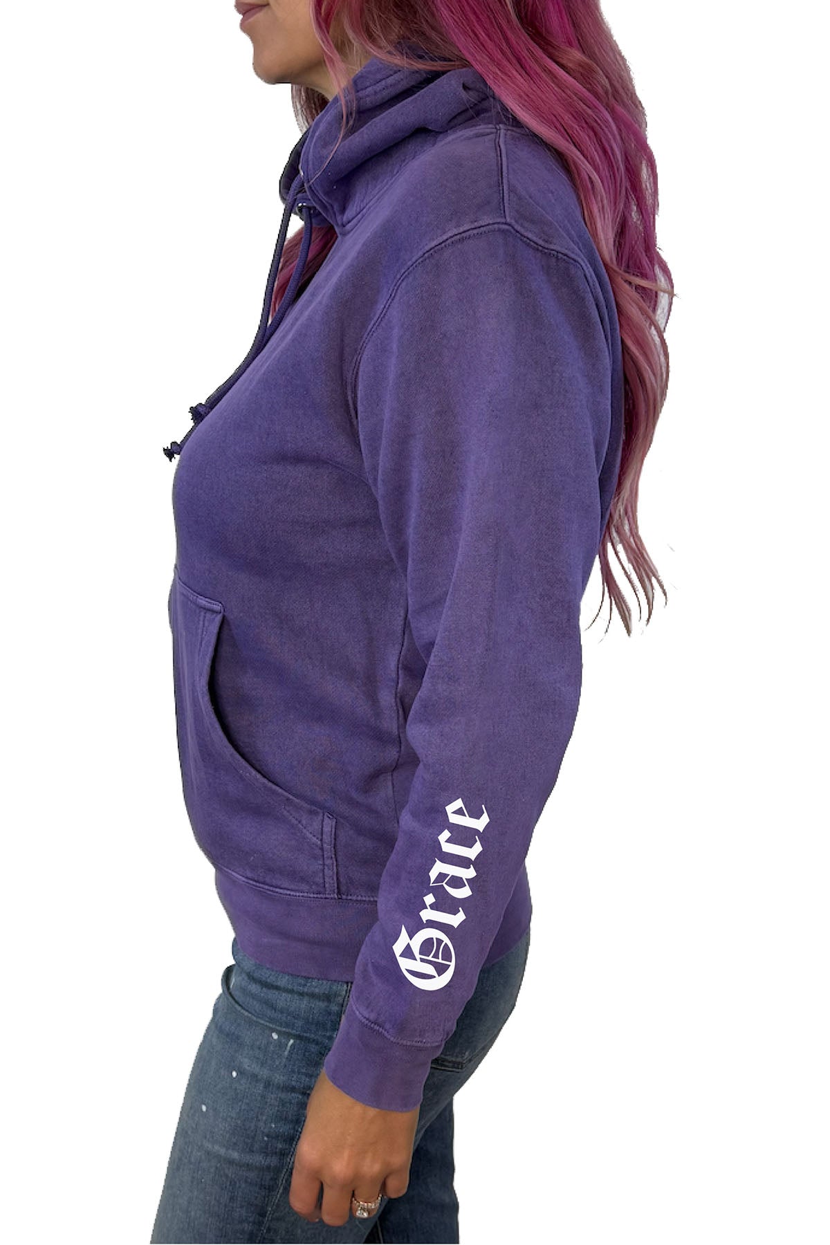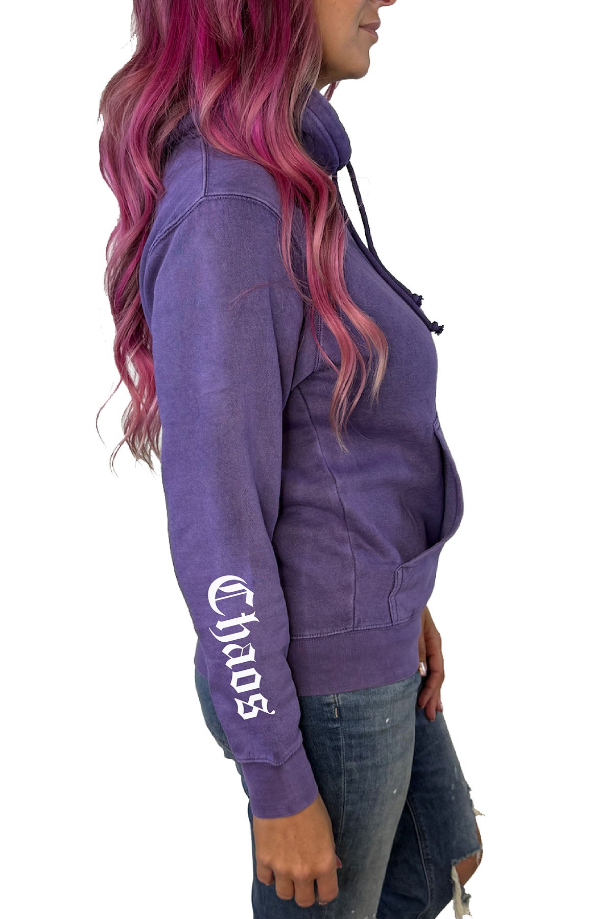 🖤 Deep purple mineral wash = moody perfection 🖤 “Chaos” + “Grace” printed down the arms 🖤 Front kangaroo pocket for comfort and edge