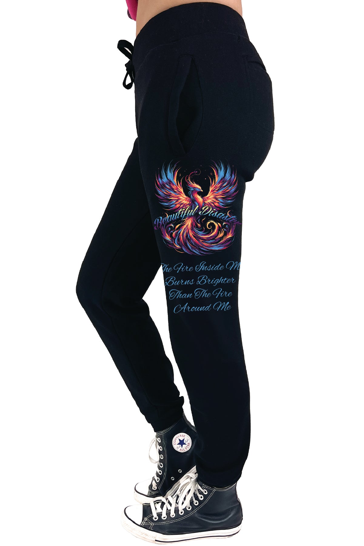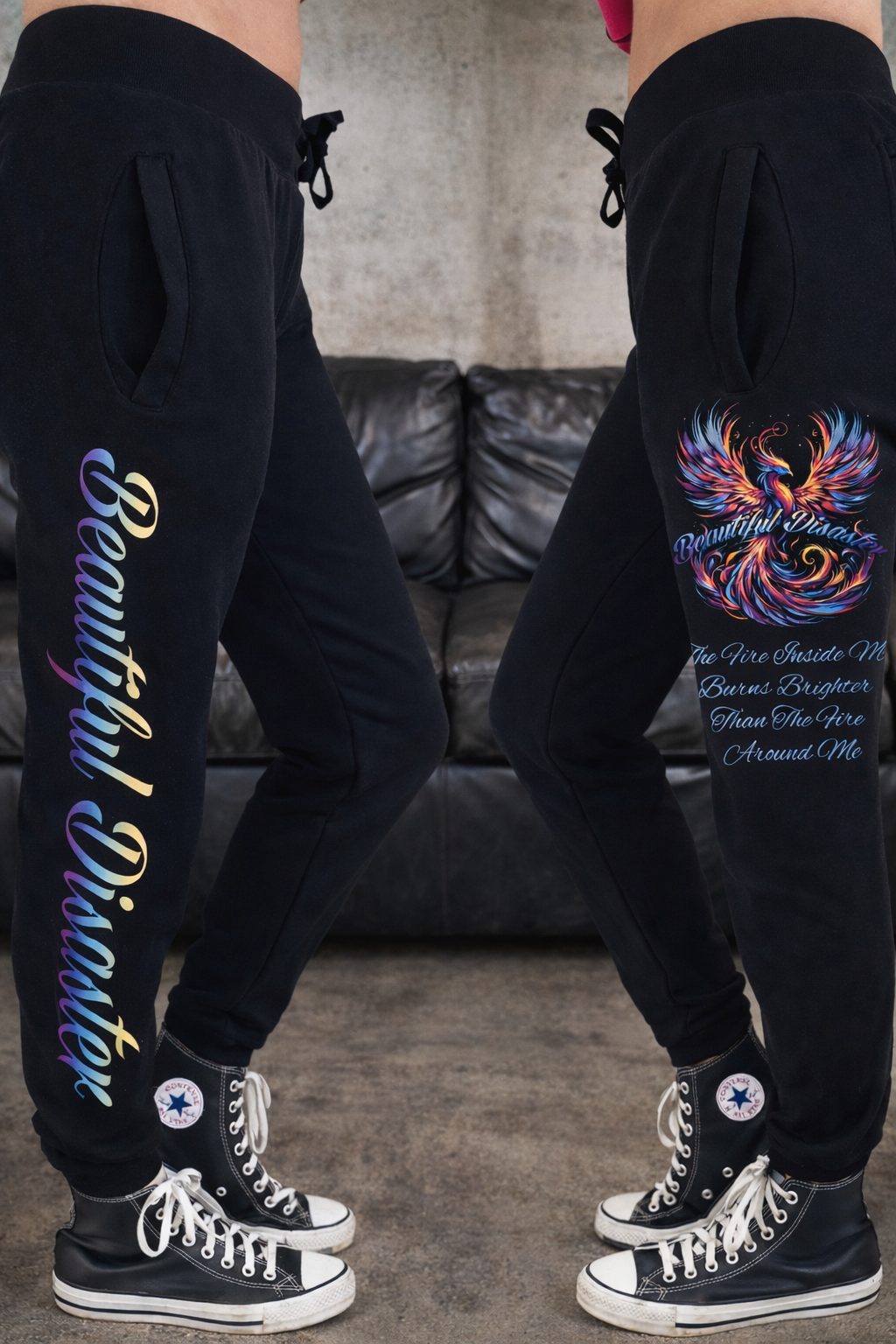 With a bold, multicolor phoenix design on one leg and Beautiful Disaster in gradient script down the other, these sweats bring the heat — visually and emotionally.