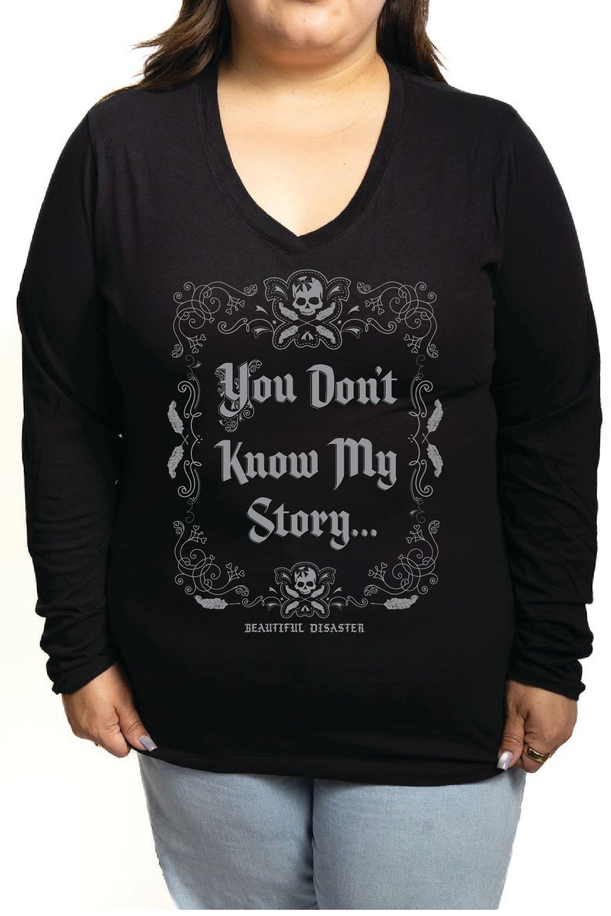This long sleeve features the bold front message “You Don’t Know My Story…” and a powerful back print: